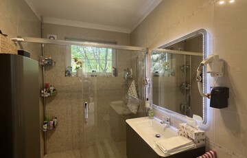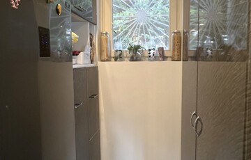 • a nappali előteréből nyíló fürdőszoba egyedi üvegezett zuhanyzótérrel,