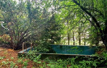 nyaralóház. Van egy kiépített, de használaton kívüli, felújítást igénylő medence. Mindkét