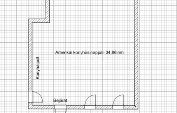 Alapterülete 44 nm, jelenleg 1 nagy szobás, amerikai konyhás elosztású, de könnyedén 1,5-2 szobássá alakítható több féle alaprajzi lehetőséggel.