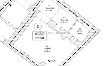 A2 lakás: A földszinti ingatlan 49 m2 alapterületű, előtér, nappali, konyha-étkező és fürdőszoba kapott helyet benne, a nappali mérete és belmagassága lehetővé teszi galéria kialakítását.