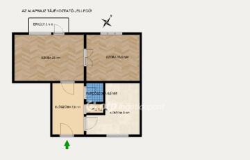 A nagyobbik szobához erkély kapcsolódik, ami egy csendes, hangulatos udvarra néz. Az elrendezése könnyen alakítható, fűtése gáz héra cserépkályha. A szobák jelenleg egybenyílnak, külön konyha, fürdőszoba és mellékhelyiség, valamint közlekedő található.