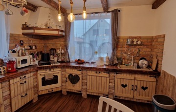• Vintage stílus, modern megoldások: A konyha és a fürdőszobák stílusos felújításon estek át, minőségi burkolatokkal és egyedi konyhabútorral. A nappaliban egy minőségi és egyedi cserépkályha teszi még különlegesebbé a teret.