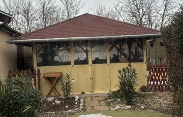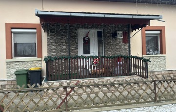 Kovácsolt vas kerítés, egy kisebb terasz, garázs, alsó épület, tároló és 4×4 méteres téliesített filagória is tartozik az ingatlanhoz, amely mögött füves terület helyezkedik el egy kis játszótérrel. A padlás szigetelt.