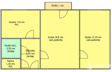 Helyiségei: 2 szoba, konyha, kamra, előszoba, fürdőszoba, erkély.