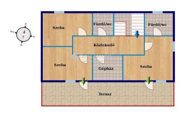 A kétszintes lakótérben (108 m2) amerikai konyhás nappali, 3 hálószoba kapott helyet. Különlegessége, hogy a ház földszintjén egy, míg az emeleten két külön fürdőszoba található, a szülők és a gyerekek kényelméért!