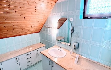 Az emeletre egy egyáltalán nem meredek, de rendkívül világos lépcsőn jutunk fel, ahol további 3 hálószoba, fürdő és wc áll rendelkezésre.