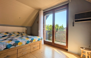 Az 576 m²-es, gondozott telek napos, mégis árnyékos, fákkal és gyümölcsökkel beültetett.