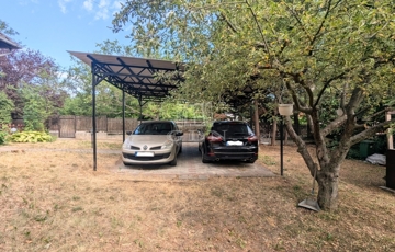 A fedett, dupla kocsibeálló kényelmesen közelíthető meg, a kapu távirányítóval vezérelhető.