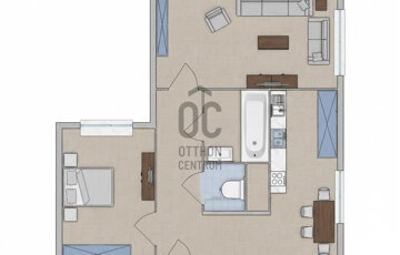 A lakás tágas előszobája-közlekedője mellett egy konyha-étkező, fürdőszoba, külön WC és két világos szoba található.