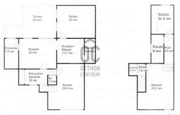 - helyiségek a földszinten: 2 hálószoba, nappali, amely terasz /23 m2/ kapcsolattal rendelkezik, közlekedő, konyha-étkező, fürdő-WC, külön WC, garázs-103 m2