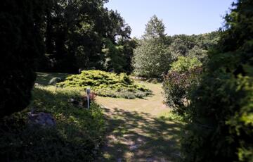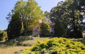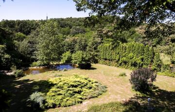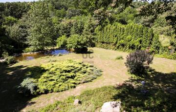 Felső részére épült a három szintes ház, a középső részen gondozott, hangulatos kert, halastó, az alsó részen pedig saját kis erdő.