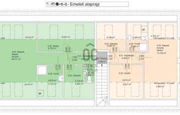- Ezeken kívül egy közlekedő, raktár, terasz lett leválasztva, 33,2 m2 nagyságban, illetve egy garázs, ami 23,6 m2.