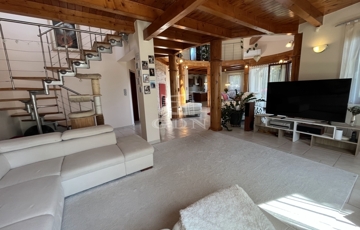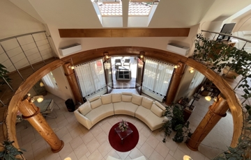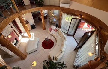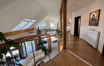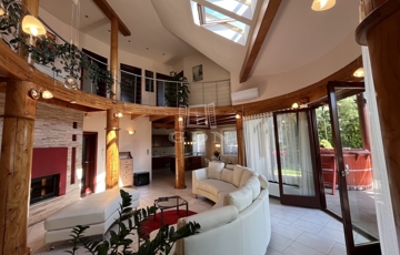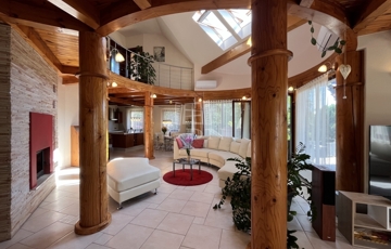 • 6 méteres belmagasságú, különleges kivitelezésű, galériás nappali, kandallóval