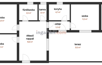A családi ház az alábbi helyiségekből áll: nappali/étkező 16,8 nm, szoba 13,1 nm, szoba 13,9 nm, szoba 11,3 nm, konyha 4,7 nm, fürdőszoba 4,5 nm, kamra 1,9 nm, előtér 3,2 nm, kamra 8 nm, fedett terasz 31,5 nm.
