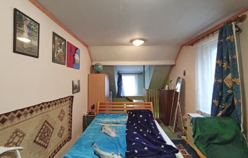 Az emeletre a nappaliból, a pillangó lépcsőn jutunk fel, balra fordulva a 11,7 nm-es járólapos hálószoba nyílik, ebből a szobából nyílik a másik, 10 nm-es járólapos hálószoba, innen egy 2,4 nm-es kádas, ablakos fürdőszobába jutunk.