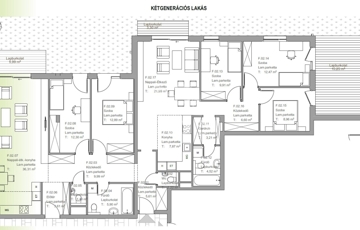 Felosztása a következőképpen alakul: fürdőszoba (5.9 nm, 4.52 nm), amerikai konyhás nappali-étkező (29.86 nm, 30.64 nm), közlekedő (9.99 nm, 6.60 nm), 5 szoba (12.30 nm, 12.89 nm, 9.91 nm, 12.47 nm, 8.96 nm ), wc helyiség (1.22 nm, 1.40 nm).