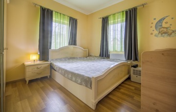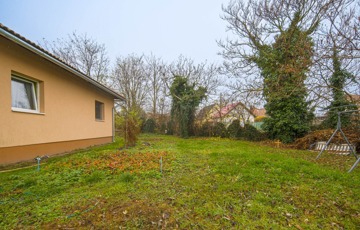 Az ingatlan a 22 m²-es garázson keresztül kapcsolódik a szomszédos épülethez. A nagyméretű teraszra a nappaliból lehet kilépni, és a telek elrendezésének köszönhetően az ingatlan szinte teljesen körbejárható.
