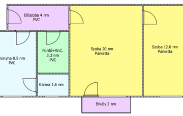 Helyiségei: 2 szoba, konyha, kamra, előszoba, fürdőszoba, erkély.