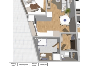 Ez a 37,74 nm²-es + 5,7 nm-és erkéllyel, első emeleti, nappali + 1 szobás elrendezéssel, konyha–étkezővel, fürdő-WC-vel és előtérrel rendelkezik.