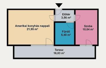 A 41 m²-es ingatlan praktikus elrendezésű: egy hálószoba, valamint egy tágas, 22 m²-es amerikai konyhás nappali alkotja. A lakás különlegessége a 17 m²-es, panorámás terasz, amelyhez mind a nappaliból, mind a hálószobából közvetlen kijárat nyílik.