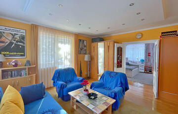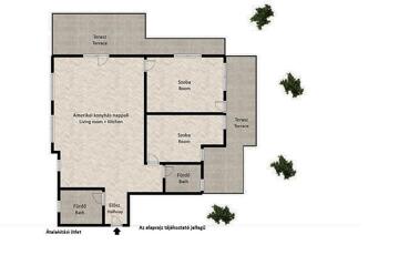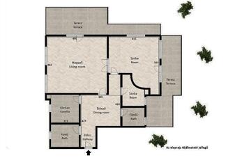 Központi helysége az étkező, amelyből a 3 szoba, a konyha és a két fürdőt is közvetlenül elérjük. Nappalija kényelmes méretű, napos, nagyméretű nyílászárókkal szerelt, a csendes hátsó kertre néz és teraszkapcsolattal rendelkezik. A nagy méretű hátsó terasz remek pihenési lehetőséget kínál a lakók részére, akár egy étkezéshez akár egy kellemes baráti beszélgetésre.