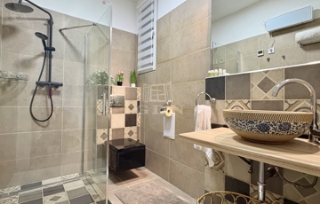 -Zuhanyzós fürdőszoba mosdóval és WC-vel