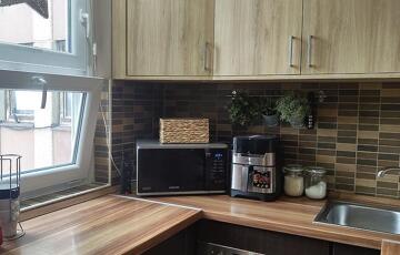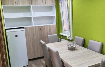 A konyha jól felszerelt, a konyhabútor, mosogatógép, tűzhely és a sütő is az ár részét képezi, az étkezőben található beépített szekrénnyel együtt, a többi bútor megbeszélés tárgyát képezi.