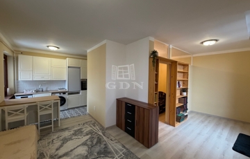 A lakás felszereltségéhez tartoznak a képen látható bútorok, mosógép, mosogatógép, sütő, indukciós főzőlap.