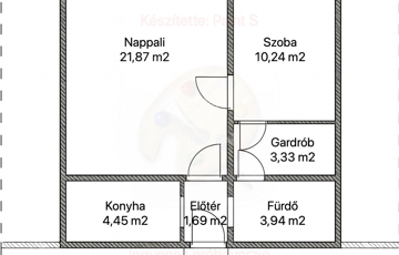 előszoba(1,69m2), konyha(4,45m2), nappali(21,87m2), szoba(10,24m2), gardróbszoba(3,33m2), fürdőszoba+WC(3,94m2)