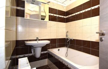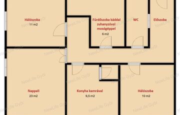 Elosztása: előszoba, konyha étkezővel, kamrával, nappali, két tágas hálószoba, fürdőszoba zuhanyzóval, káddal és külön WC-vel.