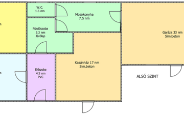 Az alsó szint helyiségei: 1 szoba, konyha, fürdőszoba, külön nyíló W.C., mosókonyha, előszoba, kazánház, dupla garázs.