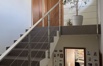 Az előtérből pár lépcsőfokon át a 3 szobát + fürdőt tartalmazó szintre juthatunk.