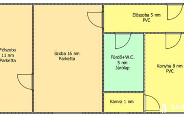 Helyiségei: 1 szoba, 1 félszoba, konyha, kamra, előszoba, fürdőszoba.