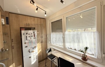 Elrendezését tekintve : Dél - keleti fekvésű , napfényes világos , két külön nyíló szoba , a kisebbik lodzsa kapcsolattal , konyha , széles közlekedő , fürdő -wc egyben …