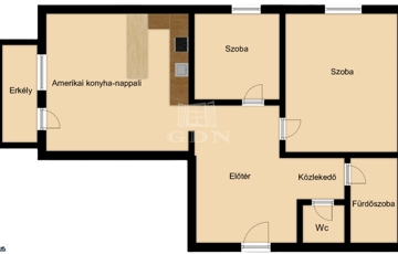 - A lakás központi tere a modern amerikai konyhás nappali, ahonnan közvetlen kijárat nyílik a 3 m²-es erkélyre. A fürdőszoba és a WC külön helyiségben található, ami praktikus és kényelmes megoldás a mindennapokban.