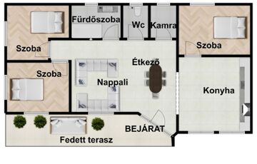 -120nm-es családi ház(amerikai konyhás nappali, 3 szoba, előszoba, fürdőszoba, kamra) mellett 15nm-es terasz