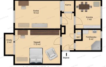 Elosztása: tágas nappali erkéllyel, nagyméretű hálószoba, konyha, kamra, zuhanyzós fürdőszoba külön WC-vel, közlekedő.