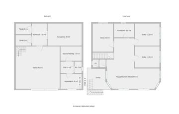 A felső szint (nettó 100 m²) a mindennapi életteret biztosítja, amely belső lépcsőn és kintről is megközelíthető, így több generáció számára vagy részben elkülönített használatra is kiváló.