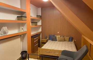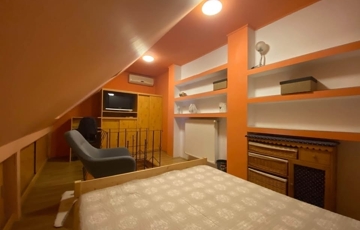 Elrendezése: Alsó szinten található az előszoba, nappali/konyha és a fürdőszoba, amiben külön üvegajtóval leválasztott tusoló fülke van. Ezek együttes mérete 27nm. Az egy szinttel magasabban található hálószoba mérete 18nm, amiben jó helykihasználó beépített szekrények vannak.