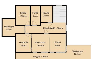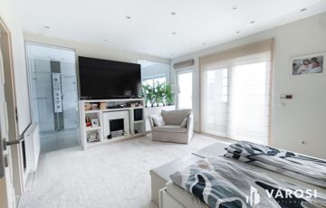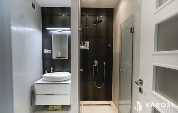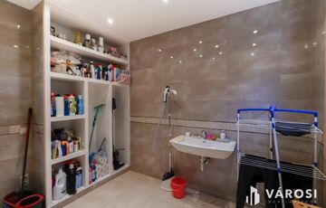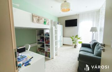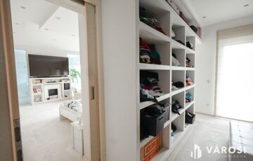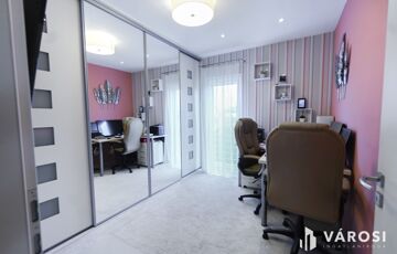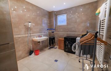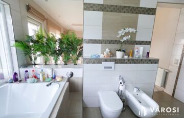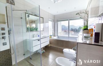 Az emeleti fürdőből egyedülállóan élvezheti a táj szépségeit akár fürdés közben a szintén nagyfelületű ablakoknak köszönhetően. Tágas gardrób, padlófűtés, dekorvilágítás, mosószoba.