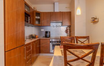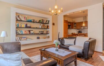 A napfényes nappali és konyha egy légtérben helyezkedik el, ami tökéletes a modern életvitelhez.