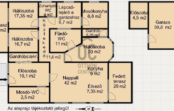 - a földszint + pinceszint helyiségei: 3 hálószoba, nappali, konyha, étkező- terasz kapcsolattal, előszoba, közlekedő, gardrób, mosókonyha, 2 fürdő-WC-vel, 1 WC, lépcsőfeljáró, garázs stb.