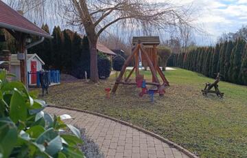 Az udvar 1528 m2 nagyságú, melyen épített, fedett kerti kemence kapott helyet. Az udvar további részén 2023-ban egy impozáns 30 m2 nagyságú úszómedence is kialakításra került. Mellette egy 25 m2 csodaszép fedett kerti pihenőhely biztosítja a családi és baráti összejövetelek önfeledt kikapcsolódását és pihenését.