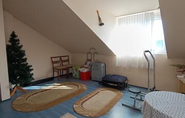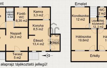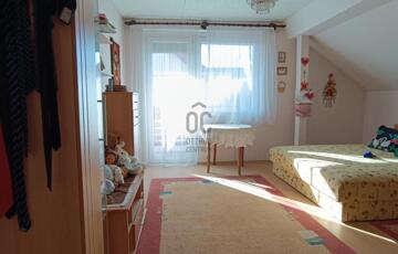 Emelet helyiségei: 3 hálószoba, amelyből az egyik erkély kapcsolatos, fürdő-WC, közlekedő