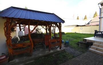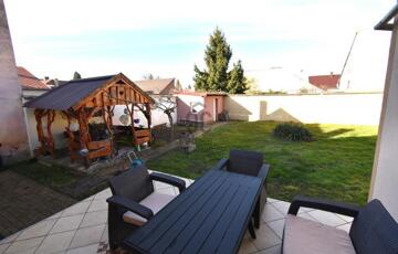 - A tágas belső udvar füvesített. Tároló és kerti kiülő is helyet kapott.