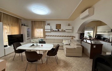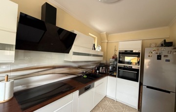 A 2021-ben készült, egyedi méretre gyártott, teljesen gépesített konyhabútor nemcsak modern, hanem praktikus is, a részleges burkolatcserék pedig friss, ápolt összképet adnak az otthonnak.