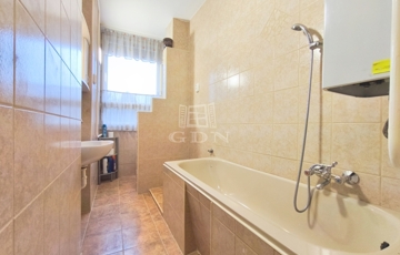A fürdő és a WC egy légtérben található, azonban egy térelválasztó fal biztosítja a praktikus használatot.
