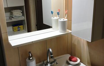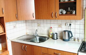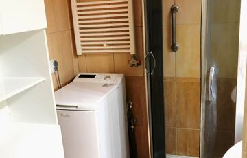 A fürdőszobában az eredeti kád helyett tuskabin lett beépítve és a konyha sem az eredeti.