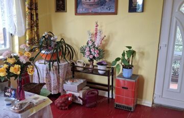 Előkertje virágos, hátsó kertje gyümölcsfákkal, bokrokkal és árnyékot adó tűlevelűekkel beültetett.