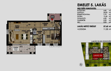 Emelet 5 lakás: 57.65 nm + 11.35 nm loggia